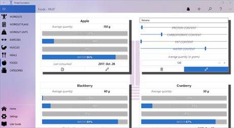 What are the foundations of fitness? Fitness Foundation is your best choice if you're looking for the answer or if you have found it already, but need a companion in achieving your goals. Track your progress in the gym with unlimited exercises, measurements and workouts. Know your calorie and macronutrient intake by automatically calculated values based on what you consumed during the day. Create workout plans and daily intake goals to fully realize the magnificent fitness lifestyle. We hope this application will help those seeking a healthier life all around the world, while showing the path to true happiness. Because in our opinion this is what fitness is all about. In Fitness Foundation you can: - save your exercises - save your workouts - save your workout plans - follow the duration and energy consumption of each exercise and workout - create muscle groups and measuring units - view charts, calculate BMI, BMR - save meals - save foods - follow daily calorie and macronutrient intake - calculate calorie and macronutrient goals - synchronize the database across every device you use via the cloud - export workout plans to Microsoft Excel - import the database from the previous version of the application (Windows Phone 7-8.1) and much more!