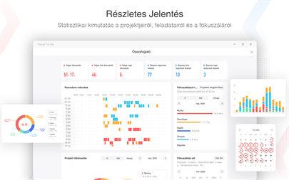 - ???? Jelentés: Részletes statisztikák az ideje eloszlásáról és végrehajtott feladatokról. Tekintse meg fókuszideje Gantt-diagramját, teljesített feladatainak statisztikáját, projektjei időbesztását, illetve a trenddiagrammot fókuszidejéről és a feladatairól.