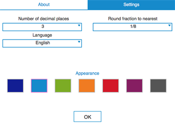 APP'S SETTINGS: - Rounding results to the desired number of decimal places. To round results to the nearest whole number, select 0 decimal places. - In Fraction Calculator and Fraction Converter, you can select to round fractions to the nearest 1/2, 1/4, 1/8, 1/16, 1/32, 1/64, 1/128, 1/256. By default, the app rounds fractions to the nearest 1/32. If you do not need to round fractions, just select "-". - 7 color schemes. - Supports 18 languages: Chinese, Czech, Danish, Dutch, English, Finnish, French, German, Greek, Italian, Japanese, Korean, Norwegian, Portuguese, Russian, Spanish, Swedish, Turkish.