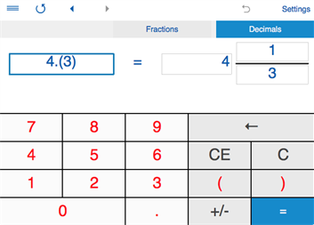 ► FRACTION CONVERTER - Converts fractions to decimals and vice versa. - Supports proper and improper fractions, mixed numbers, terminating and repeating decimals. - To convert a fraction to a decimal number, tap ‘Fractions', input a fraction or a mixed number and tap "=". - To convert a decimal number to a fraction, tap ‘Decimals’, enter a decimal number using the decimal point "." as separator (eg. 1.23) and tap "=". You can use this converter for both terminating decimals and repeating decimals. For repeating decimals enclose the repeating digits in parenthesis. Eg. type 0.24(3) for 0.24333... If the number is 5.123123..., type 5.(123). - Round fractions to the nearest 1/2, 1/4, 1/8, 1/16, 1/32, 1/64, 1/128, 1/256.