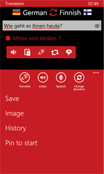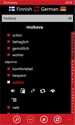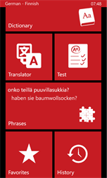 •German → Finnish 67,000 words and phrases. •Finnish → German 70,000 words and phrases. •Test, flashcard, listen test, writing, dual game and more... •German ↔ Finnish translator (online). You can translate text and listen. •800 phrases