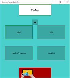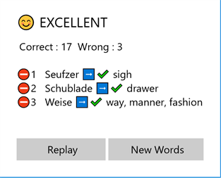 German Word Quiz Pro will help you to learn German words. This App includes most used about 1000 top German words and asks them randomly. You will asked 20 questions and can at the end of quiz, replay the same words or decide to get new 20 words.