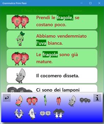 Un'applicazione per gli alunni della scuola primaria (classi seconda e terza) oppure per studenti alle prime armi con la grammatica italiana e l'analisi grammaticale. "Grammatica Primi Passi" contiene dodici esercizi di analisi di verbi, nomi, aggettivi, articoli. Ogni esercizio si compone di dieci frasi; le frasi cambiano ogni volta che si ripete lo stesso esercizio. Al suo avvio, l'interfaccia dell'applicazione si presenta in bianco e nero e si colora man mano che si eseguono gli esercizi; gli esercizi già eseguiti sono registrati, e si presentano colorati al successivo riavvio dell'applicazione.