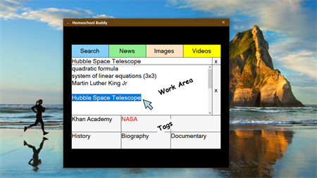 This application combines the technologies of Google, Youtube, Speech, Khan Academy, and similar technologies in a precise way that allows students to get the educational information they want using a simple, "SELECT and TAP" technique. Homeschool Buddy works seamlessly with ALL applications on the desktop, both online and offline.