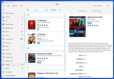 • Loaded with millions of items from around the world in our database. • Full barcode scanning (with handheld scanner) and database search. • Cloud Backup • Sync across multiple devices, including mobile devices and the web • Supports input in any language and allows selections of any country and currency. • Filters, sorting, and importing. • Three different custom layouts. • Exporting • Shake to Select • Default Field Data • Customize which fields are displayed • Section Counts • Share your collection with friends or on social media like Facebook and X (Twitter). • Format your Titles with A, An, or The removed. • Extra features like colored Themes and more. • Every field is editable. • Store up to four pictures per item, including front, back, and inside images of items. • Personal details per item including Loaned, Purchase Price, Purchase Date, Date Added, Personal Rating, Last Watched, Storage Location, Opened, Notes, Estimated Value, and more. • Index bars and search for quick access in large collections.