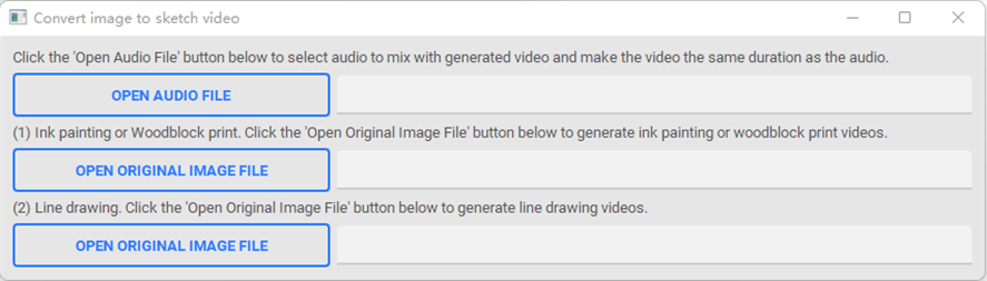 img2video应用程序软件可以将图像转换为素描视频。 素描包括两种风格:(1)水墨画或木版画;(2)白描画。 如果点击界面右上侧的“USER GUIDE”(“用户指南”)按钮,软件使用说明的网页将在默认浏览器的新选项卡上打开。 1. 单击下面的"SELECT AUDIO FILE (OPTIONAL)"(“选择音频文件(可选)”)按钮,选择要与生成的视频混合的音频,并使视频的持续时间与音频相同。 音频文件扩展名包括(*.mp3*.wav*.ogg*.m4a*.flac*.ape)。 2. 单击下面的"SELECT ORIGINAL IMAGE FILE" (“选择原始图像文件”)按钮,选择将转换为素描视频的图像。 图像文件扩展名包括(*.jpg*.png*.jpeg*.bmp*.tif*.tiff)。 3. 选择"Ink painting or Woodblock print"(“水墨画或木版画”)。 点击下面的"SELECT FOLDER TO SAVE INK PAINTING VIDEO"(“选择文件夹保存水墨画视频”)按钮,生成并保存"水墨画"或"木版画"视频。 4. 选择"Line drawing"(“白描画”)。 点击下面的"SELECT FOLDER TO SAVE LINE DRAWING VIDEO"(“选择文件夹保存白描画视频”)按钮,生成并保存"白描画"视频。