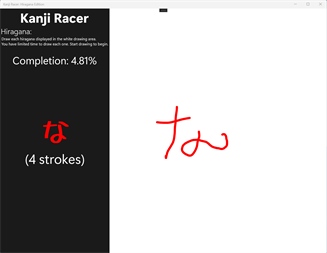 Learn to write all the Hiragana in a fast-paced time trial game. Use the mouse, stylus or your finger to draw the Hiragana before the time runs out. If you complete the game, you should be fully able to write in Hiragana. This is the first edition of the Japanese writing practice game series "Kanji Racer".