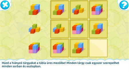 Ez az oktatójáték több mint 20 feladványt tartalmaz - Találd ki egy formáról, hogy nézhet ki felül- és alulnézetből! - Keress két alakot, melyek együtt egy négyzetet raknak ki! - Folytasd a formákból álló sorozatot! - Találd ki, melyik lapok határoznak meg egy kockát! - Sudoku formákkal - Határozd meg hány darabból áll a forma! - Keresd a nem odaillő formát! - Keress hasonló formákat! - stb.