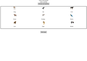 Interactive application, made for young kids or teenagers/adults learning the English language When a picture of an animal is clicked audio is played, saying the name of the animal and spelling the animal.