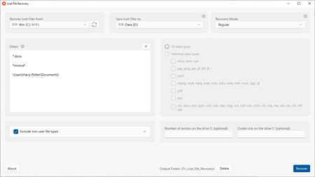Lost File Recovery supports a fully list of Windows File Recovery options: Regular, Extensive, NTFS, Segment, Signature, Recycle Bin, System files and No primary data streams. You can easily add wildcard filters for files and folders to be recovered. When recovering with Signature mode, you can choose different supported data types: image, audio, video, document and more. Actually, you can recover all lost files that are not overwritten by new data yet, then use Windows Explorer to search your desired files; or you can opt-in to recover only what you want.