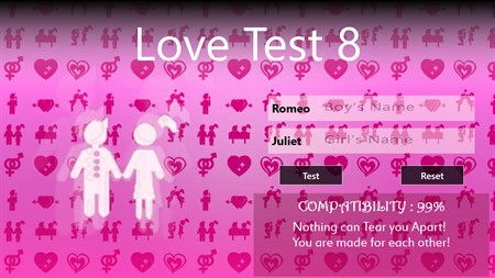 Check your compatibility with your Crush, Girlfriend/Boyfriend or Spouse. This Application is meant for Entertainment purpose. Love Test Application does not show real compatibility.