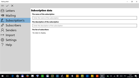 Using the app: 1. To enter the data of the sender and check them out. 2. To enter the data about subscriptions(distribution groups). 3. To enter the data about the subscribers (import subscribers). 4. To create an email template for mailing. 5. Create from the letters list. 6. Start a newsletter to all subscribers of the mailing. 7. To see the statistics of sent.