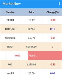 Resources: * Tracking in real time (in seconds) * Chart details (day, week, month and year) * Options (Brazilian market) * Dividends (Brazilian market)