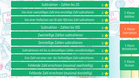 Mathe spielerisch lernen und üben. Dank handschriftlicher Zahleneingabe ist es möglich, das Ergebnis einfach mit dem Finger auf den Bildschirm zu schreiben. Folgende Aufgabenbereiche stehen zur Verfügung: