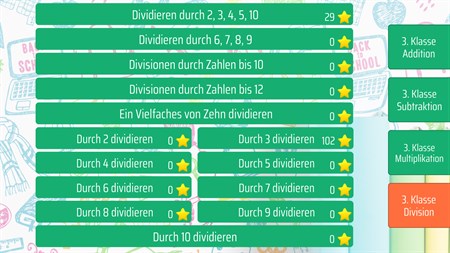 Division: Dividieren durch 2, 3, 4, 5, 10 Dividieren durch 6, 7, 8, 9 Divisionen durch Zahlen bis 10 Divisionen durch Zahlen bis 12 Ein Vielfaches von Zehn dividieren