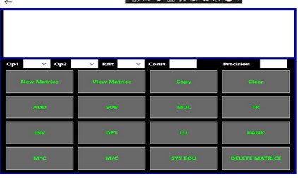Solve system of equations among many other operations on matrices. It is a Calculator for matrices both real and complex matrices. Can do many operations on matrices. Can store up to three matrices internally thus allowing the advanced user to implement a complete algorithm on a set of matrices data. This matrix calculator is used to manipulate matrices as easy and simple as a simple pocket calculator. Also has a very stylish user interface