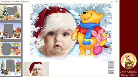 1. Select the frame you want on the left side of the app. 2. The image preview of the frame you chose will appear on the screen. 3. Click [ Add ] to add the photo you want on the frame. 4. Your photo will appear on the frame. You can add more photos if the frame allows. 5. Click [ Clear ] if you want to delete any photo you've added. 6. Click [ Save ] and select the folder you want to save your card.
