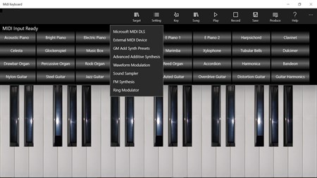 The MIDI Keyboard is a live music instrument that can control the Microsoft MIDI Synthesizer as well as other internal and external synthesizer engines. It turns a touchscreen tablet into a music keyboard with a huge number of sounds. You can also record your own songs as MIDI files or play the build in songs with different sound arrangements to create and publish new cover versions of classic songs.