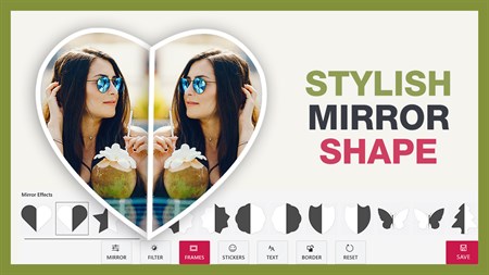 We provide you with the best photo editing tool which has rich features to add text, stickers, frames, modifying background, make mirror twins with 14+ different layouts. Mirror image is one of the most creative ways to make your pic more stunning.