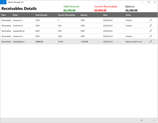 You can count the total receivables, the amount received, and the remaining amount of each receivable. You can count the total payable, the amount paid, and the remaining amount payable for each payable.