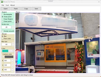 Mosaics can be generated by blurring, or a solid color can fill the selected area. The blur size is editable, and solid fills can use pre-made colors or custom colors.
