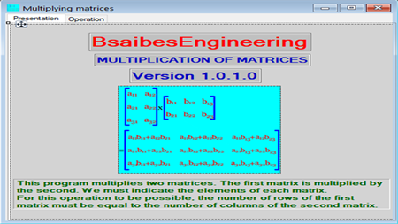 This program multiplies two matrices. The first matrix is multiplied by the second. We must indicate the elements of each matrix. For this operation to be possible, the number of rows of the first matrix must be equal to the number of columns of the second matrix.