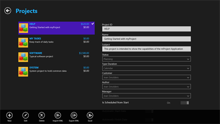 myProject is a project management app that allows you to maintain multiple projects on desktops, laptops, tablets (WinRT and Pro). The user interface of myProject is designed to utilize touch and mouse interaction where practical. All functions work as well with the standard mouse and keyboard interfaces. myProject backups can be imported in the myProjectWP Windows Phone app so you can always have your important projects available. The app has easy backup / restore as well as export / import capabilities allowing for exchanging projects with other devices and users where needed. Optional OneDrive integration is available.
