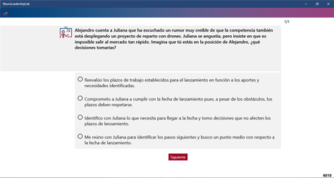 NeuroLeadershipLab (NLL) is an educational application that enables its users to know about their salience of leadership competences, and how brain activity impacts on this salience.It’s an audiovisual test that presents a business case through short videos and presents leadership-relevant questions. To read brain activity, you need to wear MUSE device and a 4.0 bluetooth antenna. You need to get a subscription to use this application. To obtain a subscription, please write to comercial@aprendizaje360.com