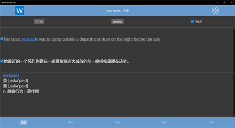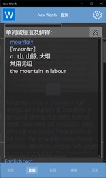 为母语是汉语的人士提供的一个学习英语的工具。自定义句子的文件格式是,单行为英语句子,双行为对应翻译。如果在app设置里面没有发现英语朗读者,请安装语言->英语,步骤为windows 设置->时间和语言->语言->添加首选语言->English->English(United States)或English(United Kingdom)->选项->语音->下载。 特色: 1. 通过句子和句子朗读来记忆,理解单词。 2. 自带词典 3. 朗读位置指示 4. 复制单词(或词组)翻译 5. 单击单词翻译 6. 导入用户句子 7. 查询历史记录 8. 中文词语->英语单词短语
