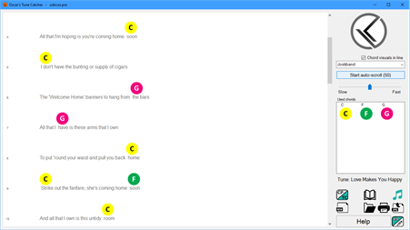 With the Tune Catcher app, you can create and share song sheets for players of various instruments. Traditional sheet music starts with individual notes which need to follow strict music theory rules. Tune Catcher is very flexible and starts with the song lyrics on top of which you can drag and drop chords. Tune Catcher provides access to Jim's Songbook with thousands of free songs sheets.
