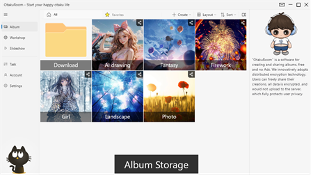 OtakuRoom is a software for creating and sharing albums. It is free and Ads-free. Using distributed encryption technology to protect user privacy, no resource server is required, and resources can be shared anonymously without review.