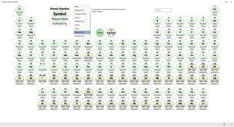 Learn about elements with this simple, colorful periodic table. Quickly view basic properties of elements right in the table: atomic mass, boiling point, melting point, radioactivity and more... Search for elements by their name or symbol. Take a closer look at each element by clicking it on the table. See more details like atomic radius, year and country of discovery, specific heat and more...