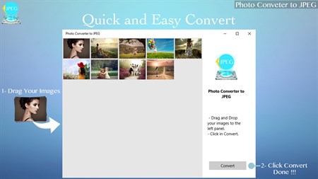 Using drag and drop engine, you do not need to be opening all you folders to select the pics you want, on Photo Converter to JPEG all you need to do is select your pictures and drag them directly to the app, and click on the Convert button and you ready to go.