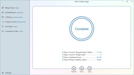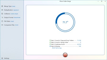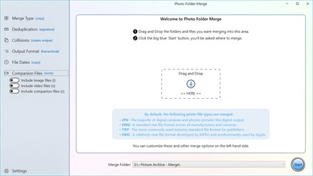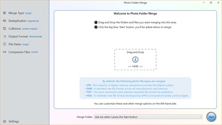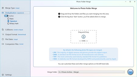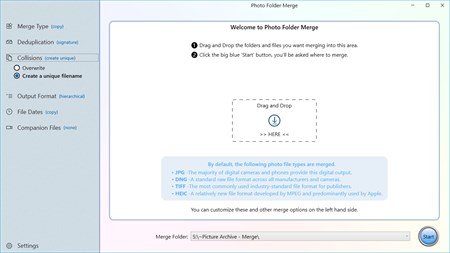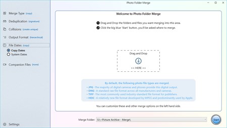 That means you can run Photo Folder Merge as many times as you need, add more folders from a camera or a long lost archive, or from multiple copies of the same folder that might have one or two newer pictures; Photo Folder Merge does all the hard work of pulling it all together and giving you that one place where all your photos and videos can live.