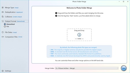 Features • Remove duplicates or allow them, the choice is yours. • Merge just photos, include videos, or include anything, regardless of file type. • Merge into a hierarchy or flat folder structure. • Copy or Move your files. • Collision detection can overwrite or create unique copies. • Keep the original file dates, or not, there's a wealth of options.
