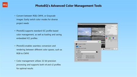 ???? Convert between RGB, CMYK, or Grayscale images: Easily switch color modes for diverse project needs ???? PhotoEQ supports standard ICC profile-based color management, as well as loading and saving embedded ICC profiles ????️ PhotoEQ enables seamless conversion and rendering between assorted color spaces, such as RGB to CMYK ???? Color management utilizes 32-bit precision processing and supports both v4 and v2 profiles for optimal results