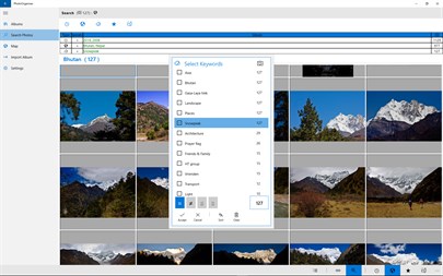 Once the albums are imported, you can view the photos in the albums in different ways. The imported albums can be viewed in the Albums page. You can order the albums by Name, Date or Photo source. The photos in the album can be viewed directly by clicking/tapping on the album. However, to use this app to its full potential you should use the Search Photos page. This page offers you an advanced way to view exactly those photos that match the filter criteria that you provide. You can search your photos across all albums and across all photo sources. The photos are ordered and grouped by either Country, Date, Rating or Orientation. You can narrow down the photos to be seen by using different filter criteria. The filter criteria can be created by using different combinations of Date, Country, Keywords (tags), Rating and Orientation and by using operators like =, ≠, ≦ or ≧. The requested photos are shown instantly. Multiple filter commands can be used that will be “stacked” so that subsequent filter commands are accomplished to the filter commands already executed. The combined filter commands can be saved so that it can be used later.