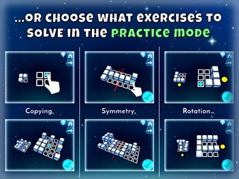 EXERCISE TYPES: - building matching 3D structures - removing extra pieces from structures - building mirror images of structures - extra challenge is provided for advanced learners by point symmetry and rotation exercises