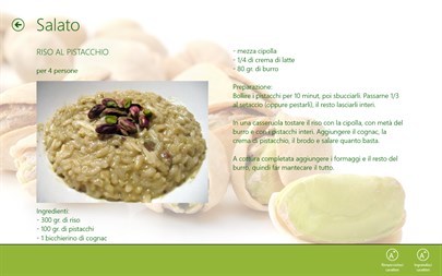 All'interno dell'applicazione trovi le ricette complete dei piatti salati e dei dolci, nonché una descrizione dei principali ingredienti (pesto di pistacchio, crema di pistacchio, ecc) essenziali per ottenere i migliori risultati in cucina.