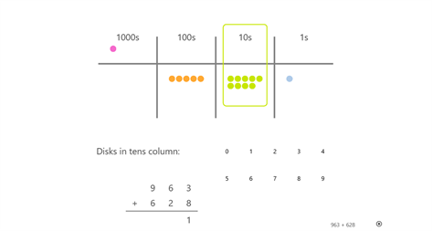 This math app is about visually adding two numbers using place value discs.