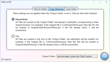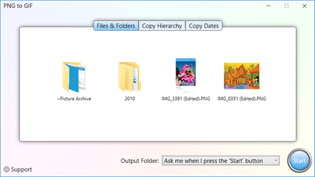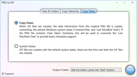 Your conversion, your way. • Create GIF files in a new folder, optionally preserving the original PNG folder hierarchy. • Create GIF files side-by-side with the PNG files, with the same filename. • PNG 'Date Taken' metadata is copied to the GIF 'Last Modified Date' as GIF doesn't support metadata • Copy the creation and modification, or use the system dates.