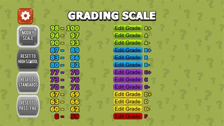 You can set up names up to 8 people and a player ID and group ID. This allows you to personalize your game. This information can be used to record on the screenshots of how well you did. You have the option to e-mail the screenshot out to someone. You have the option of changing the grading scale. This allows you to use traditional A-B-C-D-F grades or just a pass-fail system. Using the player statistics area, you can see the number of times you have tried, failed or passed as well as the high score for each area listed below.