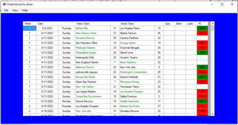 PredictAssist has two basic functions; one is to record your predictions for each game of the season, and the other is to help you make your predictions by providing both historical performance data and a copyrighted algorithm that uses performance data to generate a prediction for you. This is not intended as gambling software and the author makes no guarantees regarding the predictions made by the “PC” feature of this software. It is strongly recommended that the user read the license agreement in the appendix of this manual prior to use.
