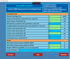 PumpNPSHCalculator is a software program that can be used to verify the Net Positive Inlet Pressure (NPIP) requirements of a reciprocating pump or Net Positive Suction Head (NPSH) requirements of a centrifugal pump.