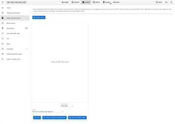 Insert the payment part with receipt into an existing invoice document. Create your invoice document in any application and export or print it as PDF in A4 portrait format. Load that PDF into this Web App and choose on which page you want to place the payment part with receipt. The resulting QR-bill can be downloaded as a PDF.