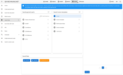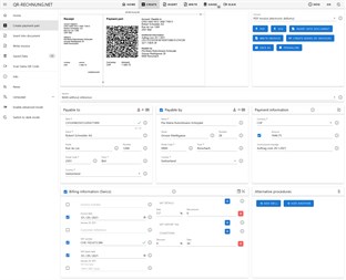 Create the payment part with receipt of a QR-bill. The result can be downloaded directly as a PDF or inserted into an existing invoice document. Save the information directly in the browser or save the permalink to later access the data again.