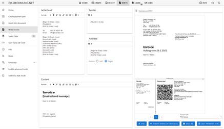 Create a complete invoice document with letterhead, address and content with integrated payment part and receipt in the text editor with live preview. The result can be downloaded directly as a PDF. With a template document with text modules, you generate invoices to several recipients.