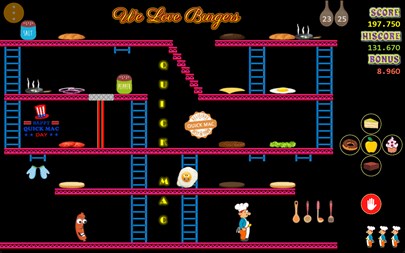 Quick Mac is a cook trying to make his own burgers. He is disturbed by the various ingredients. To help, Quick Mac can get pans that paralyze ingredients for a period of time and enable the chef to collect them. All 25 levels, which offer different challenges, must be completed. Results are presented in a local HiScore table. The top 100 top performances are listed in the International HiScore table.