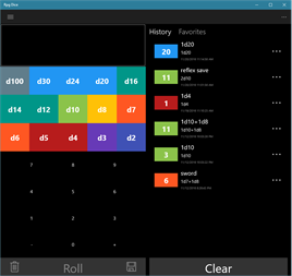 Dice rolling app that lets you create favorite combinations and keep a log of the dice that you roll. * Quick and easy to use. * Bright colors to make it easy to distinguish between the various dice. * Supports D20, DCC and Fate Dice