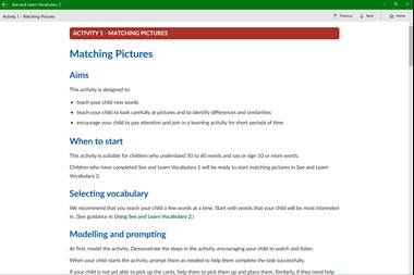 • Matching Pictures - encourages your child to look more closely at pictures introduced in the first activity, and to learn to distinguish between them • Selecting Pictures - learning to understand the spoken words by linking them with the correct pictures • Naming Pictures - encourages your child to practice saying the correct words for pictures